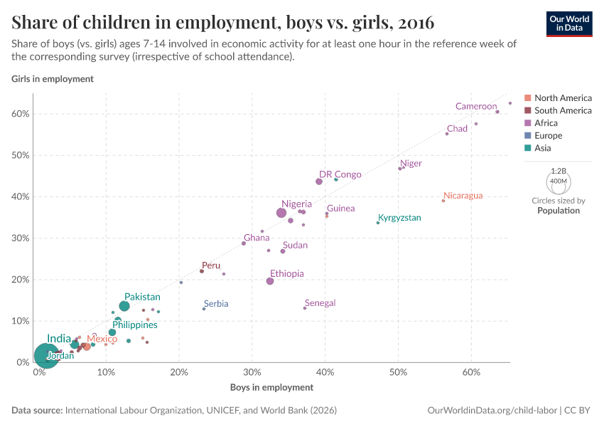 In the majority of countries boys are more likely than girls to be engaged in economic activity. The visualization here presents the incidence of child employment for boys vs. girls by country, according to estimates made available by the World Bank.