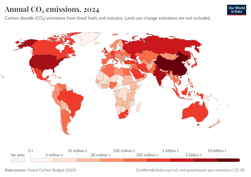 Annual CO2 emissions tell us how much each country emits in a given year. It shows us the geographical distribution of current emissions across the world.