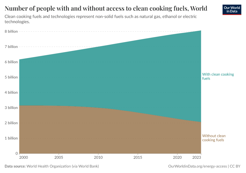 The total number of people globally without clean cooking fuels has slowly declined since 2000.