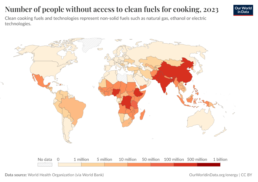 In the visualizations here, we see the number of people globally with and without clean cooking fuels and a world map of the number without access.