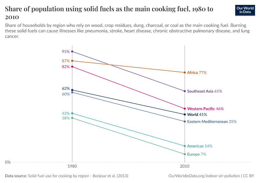 The use of solid fuels is declining in all of the world’s regions. However, the success of rapidly developing Southeast Asia is particularly impressive. Here, there has been a remarkable decline in the use of solid fuels, shifting from nearly all of the population to just over half.