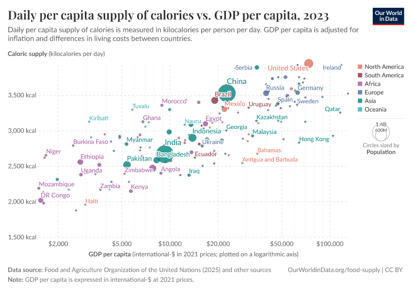 Per capita food supply therefore tends to increase with economic growth. However, this trend tends to taper off or even reverse in high-income countries.