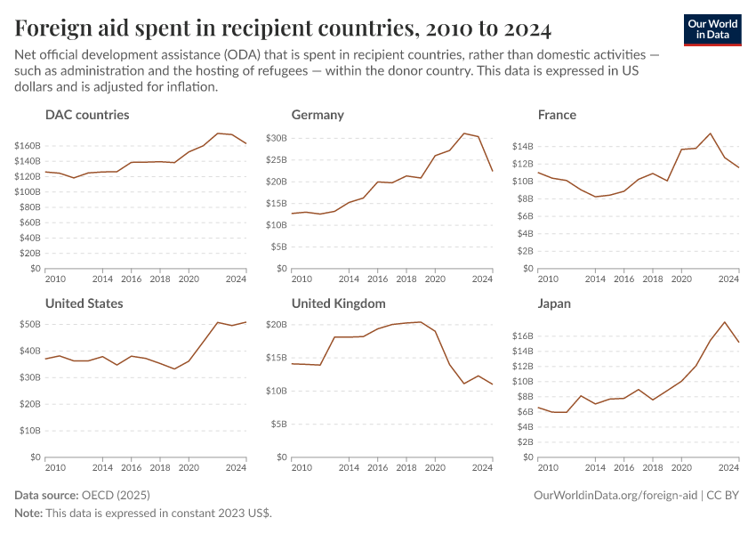Simon van Teutem, Hannah Ritchie, and Pablo Arriagada (2025) - “How much foreign aid is spent domestically rather than overseas?” Published online at OurWorldinData.org. Retrieved from: 'https://ai-search-suggested-topics-k.owid.pages.dev/foreign-aid-domestic-overseas' [Online Resource]BibTeX citation