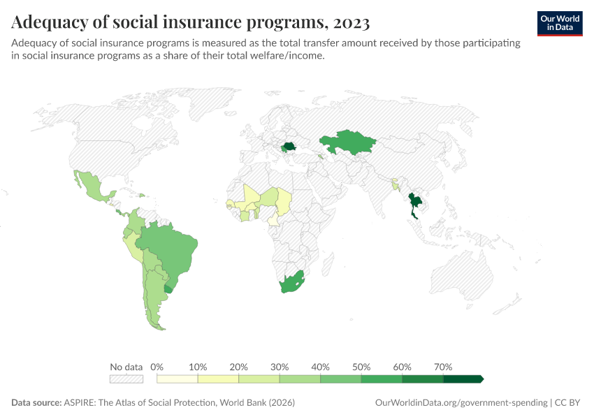 ASPIRE: The Atlas of Social Protection, World Bank (2026) – processed by Our World in Data. “Adequacy of social insurance programs” [dataset]. ASPIRE: The Atlas of Social Protection, World Bank, “World Development Indicators 125” [original data]. Retrieved March 5, 2026 from https://ai-search-suggested-topics-k.owid.pages.dev/grapher/adequacy-of-social-insurance-programs