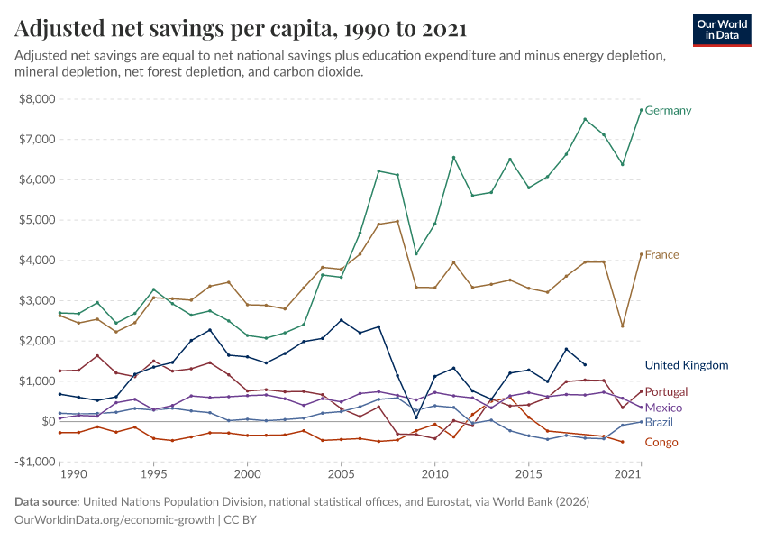 “Data Page: Adjusted net savings per capita”. Our World in Data (2026). Data adapted from United Nations Population Division, national statistical offices, and Eurostat, via World Bank. Retrieved from https://ai-search-suggested-topics-k.owid.pages.dev/grapher/adjusted-net-savings-per-person [online resource]How to cite this data