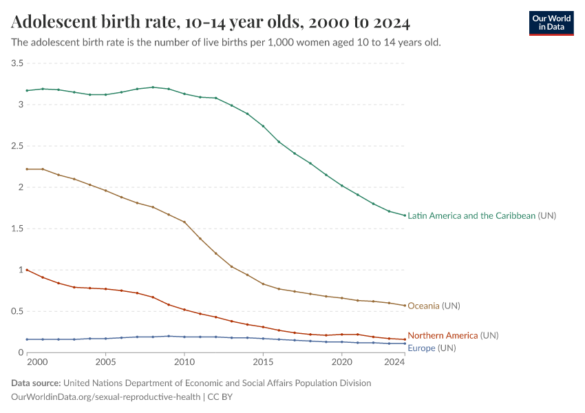 United Nations Department of Economic and Social Affairs Population Division – processed by Our World in Data. “Adolescent birth rate, 10-14 year olds” [dataset]. United Nations Department of Economic and Social Affairs Population Division, “Data from multiple sources” [original data]. Retrieved March 5, 2026 from https://ai-search-suggested-topics-k.owid.pages.dev/grapher/adolescent-fertility