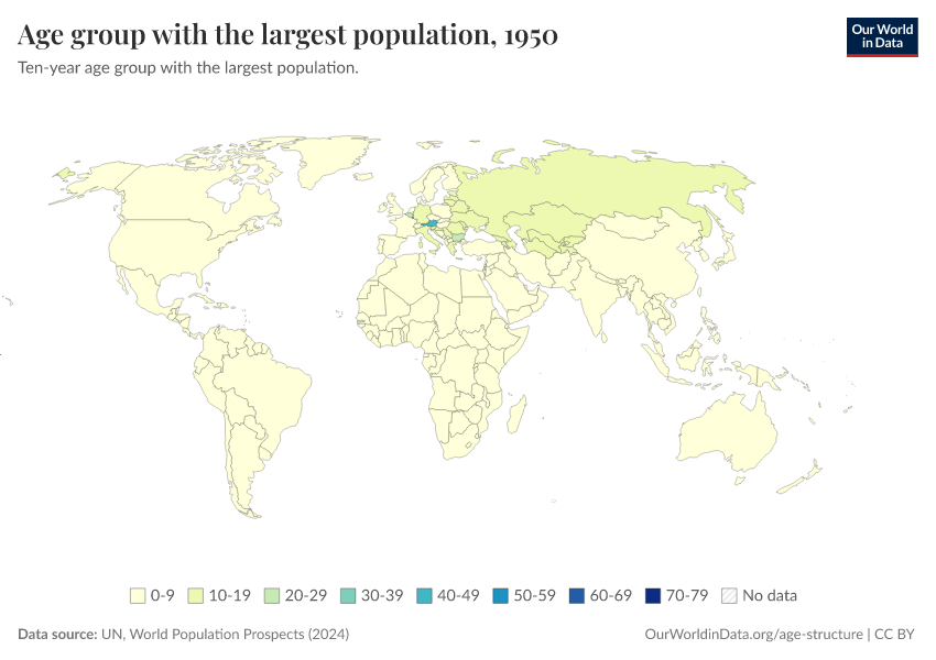 “Data Page: Ten year age-group with the highest population”. Our World in Data (2026). Data adapted from United Nations. Retrieved from https://ai-search-suggested-topics-k.owid.pages.dev/grapher/age-group-with-the-largest-population [online resource]How to cite this data