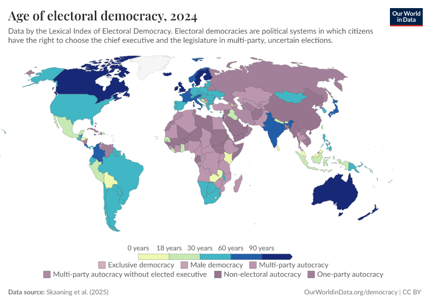Skaaning et al. (2025) – processed by Our World in Data. “Age of electoral democracy” [dataset]. Skaaning et al., “Lexical Index of Electoral Democracy (LIED) v6.8” [original data]. Retrieved March 5, 2026 from https://ai-search-suggested-topics-k.owid.pages.dev/grapher/age-of-electoral-democracy-lexical