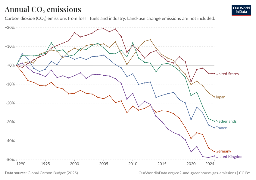 • This data is based on territorial emissions, meaning the emissions produced within a country's borders, but not those from imported goods. For example, emissions from imported steel are counted in the country where the steel is produced. To learn more and look at emissions adjusted for trade, read our article: How do CO₂ emissions compare when we adjust for trade?