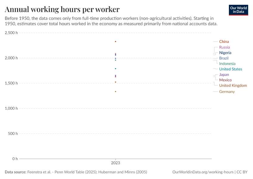 “Data Page: Annual working hours per worker”, part of the following publication: Charlie Giattino, Esteban Ortiz-Ospina, and Max Roser (2020) - “Working Hours”. Data adapted from Feenstra et al., Huberman and Minns. Retrieved from https://ai-search-suggested-topics-k.owid.pages.dev/grapher/annual-working-hours-per-worker [online resource]