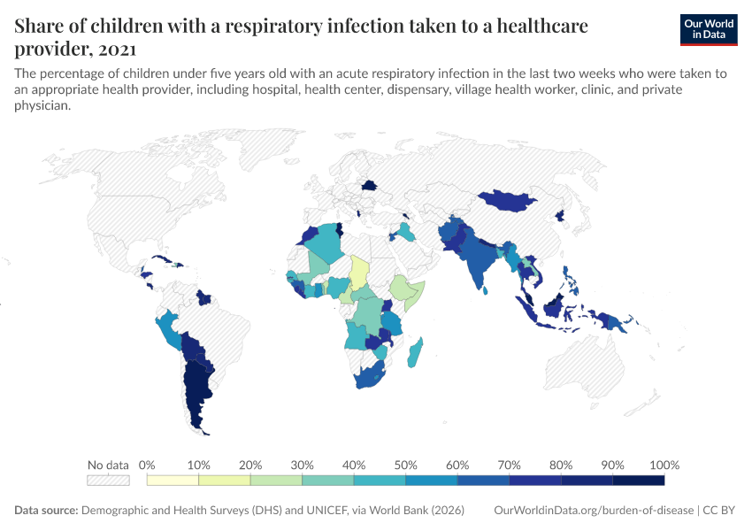 Demographic and Health Surveys (DHS) and UNICEF, via World Bank (2026) – processed by Our World in Data. “Share of children with a respiratory infection taken to a healthcare provider ” [dataset]. Demographic and Health Surveys (DHS) and UNICEF, via World Bank, “World Development Indicators 125” [original data]. Retrieved March 5, 2026 from https://ai-search-suggested-topics-k.owid.pages.dev/grapher/children-treated-ari