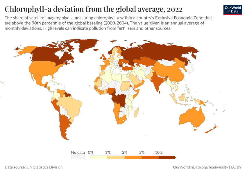 UN Statistics Division – processed by Our World in Data. “Chlorophyll-a deviation from the global average” [dataset]. UN Statistics Division, “World Environment Situation Room” [original data]. Retrieved March 5, 2026 from https://ai-search-suggested-topics-k.owid.pages.dev/grapher/chlorophyll-a-deviation-from-the-global-average