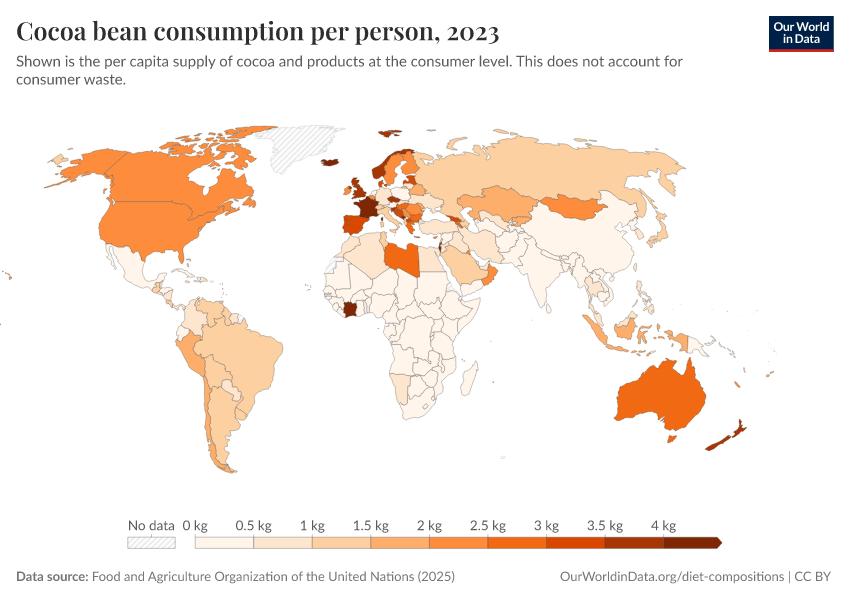 “Data Page: Yearly per capita supply of cocoa beans”. Our World in Data (2026). Data adapted from Food and Agriculture Organization of the United Nations. Retrieved from https://ai-search-suggested-topics-k.owid.pages.dev/grapher/chocolate-consumption-per-person [online resource]How to cite this data