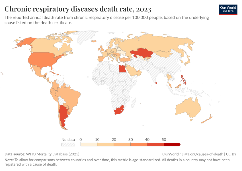 “Data Page: Chronic respiratory diseases death rate”, part of the following publication: Saloni Dattani, Fiona Spooner, Hannah Ritchie, and Max Roser (2023) - “Causes of Death”. Data adapted from WHO Mortality Database. Retrieved from https://ai-search-suggested-topics-k.owid.pages.dev/grapher/chronic-respiratory-diseases-death-rate-who-mdb [online resource]How to cite this data