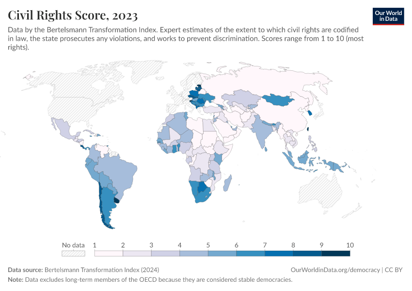 Bertelsmann Transformation Index (2024) – processed by Our World in Data. “Civil Rights Score” [dataset]. Bertelsmann Transformation Index, “Bertelsmann Transformation Index, Scores” [original data]. Retrieved March 5, 2026 from https://ai-search-suggested-topics-k.owid.pages.dev/grapher/civil-rights-score-bti