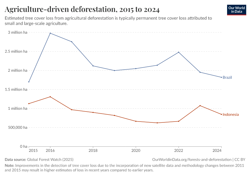 “Data Page: Agriculture-driven deforestation”, part of the following publication: Hannah Ritchie, Fiona Spooner, and Max Roser (2021) - “Forests and Deforestation”. Data adapted from Global Forest Watch. Retrieved from https://ai-search-suggested-topics-k.owid.pages.dev/grapher/commodity-driven-deforestation [online resource]How to cite this data