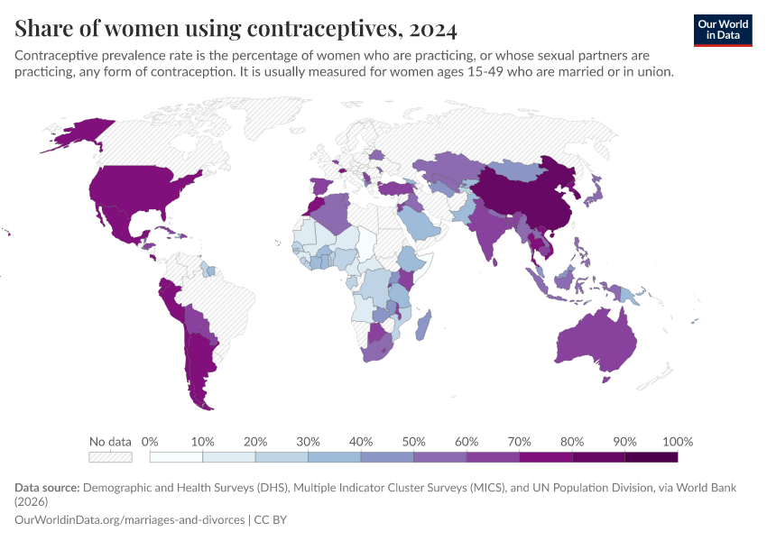 Demographic and Health Surveys (DHS), Multiple Indicator Cluster Surveys (MICS), and UN Population Division, via World Bank (2026) – processed by Our World in Data. “Share of women using contraceptives” [dataset]. Demographic and Health Surveys (DHS), Multiple Indicator Cluster Surveys (MICS), and UN Population Division, via World Bank, “World Development Indicators 125” [original data]. Retrieved March 5, 2026 from https://ai-search-suggested-topics-k.owid.pages.dev/grapher/contraceptive-prevalence-any-methods-of-women-ages-15-49