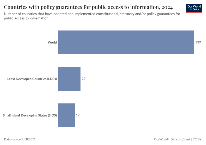“Data Page: Countries with policy guarantees for public access to information”. Our World in Data (2026). Data adapted from UNESCO. Retrieved from https://ai-search-suggested-topics-k.owid.pages.dev/grapher/countries-that-adopt-guarantees-for-public-access-to-information [online resource]How to cite this data