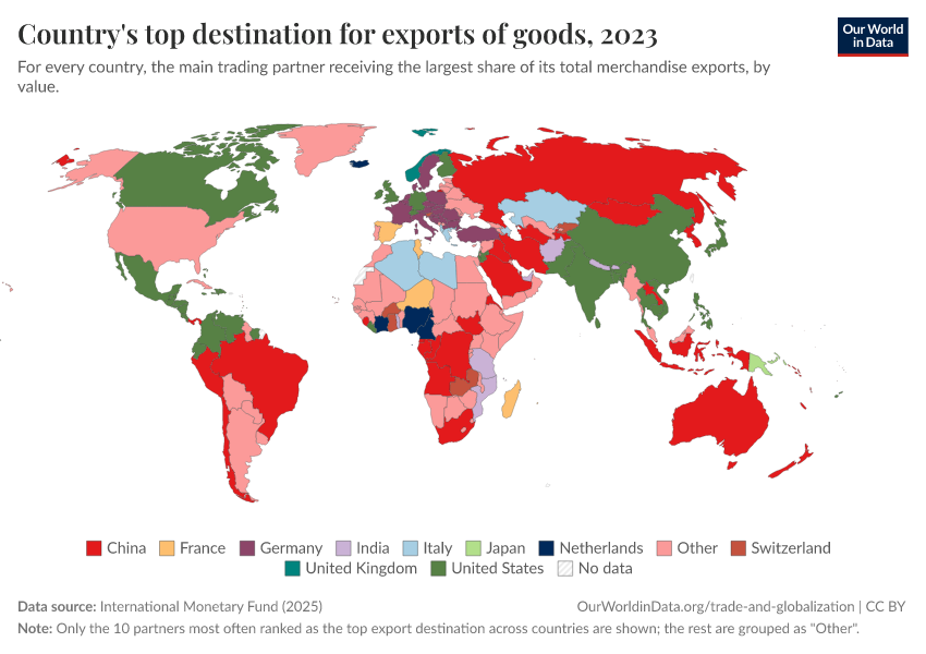 International Monetary Fund (2025) – with major processing by Our World in Data. “Top export partner category” [dataset]. International Monetary Fund, “International Trade in Goods (by partner country) (IMTS)” [original data]. Retrieved March 5, 2026 from https://ai-search-suggested-topics-k.owid.pages.dev/grapher/countrys-top-destination-for-exports-of-goods