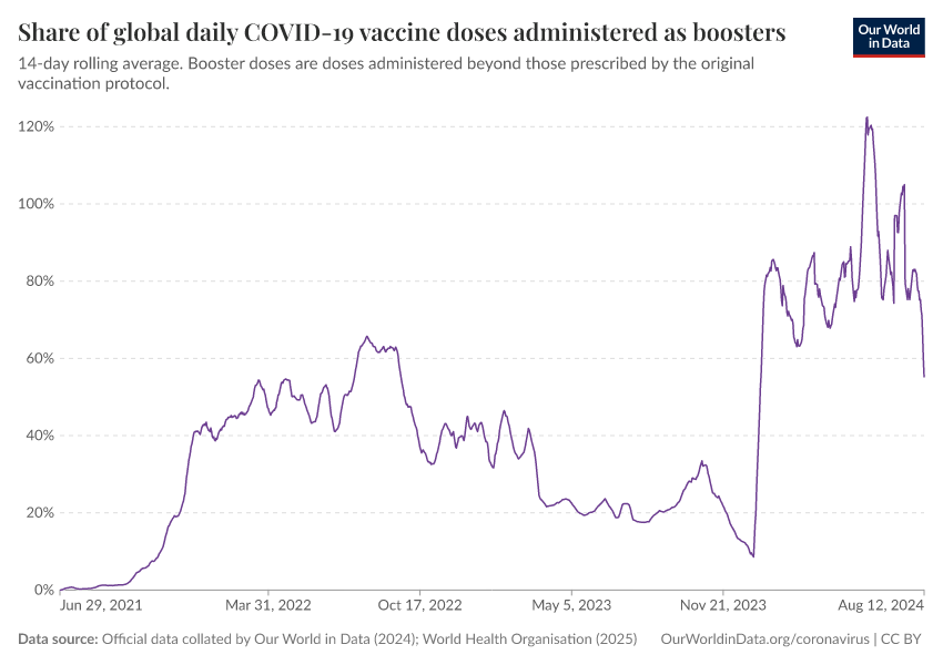 Official data collated by Our World in Data (2024); World Health Organisation (2025) – with major processing by Our World in Data. “Share of global daily COVID-19 vaccine doses administered as boosters” [dataset]. Official data collated by Our World in Data, “COVID-19, vaccinations”; World Health Organisation, “COVID-19, vaccinations (WHO)” [original data]. Retrieved March 5, 2026 from https://ai-search-suggested-topics-k.owid.pages.dev/grapher/covid-vaccine-share-boosters