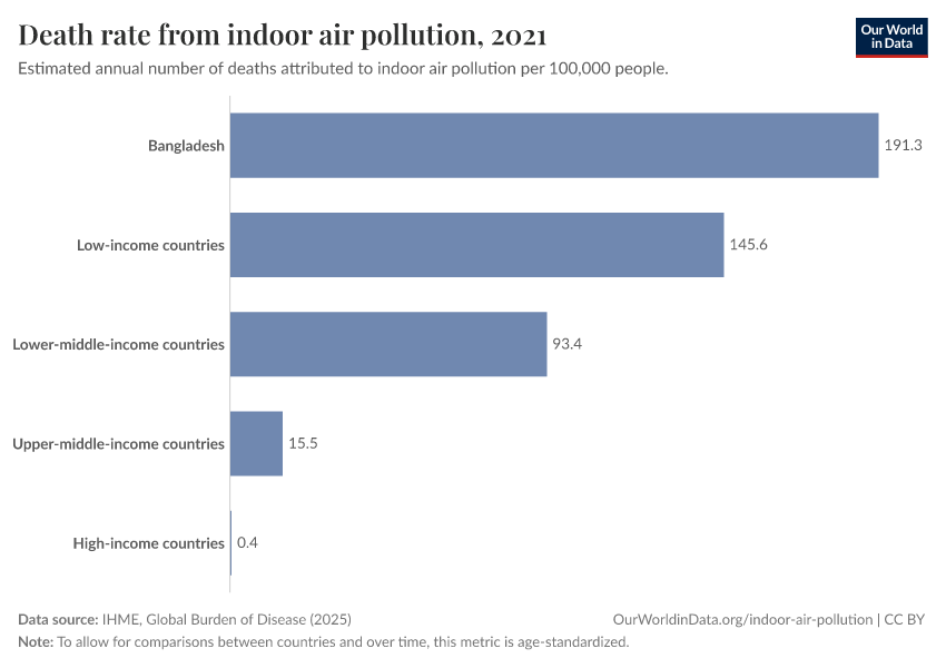 IHME, Global Burden of Disease (2025) – with major processing by Our World in Data. “Death rate from indoor air pollution” [dataset]. IHME, Global Burden of Disease, “Global Burden of Disease - Risk Factors - Deaths” [original data]. Retrieved March 5, 2026 from https://ai-search-suggested-topics-k.owid.pages.dev/grapher/death-rate-by-source-from-indoor-air-pollution