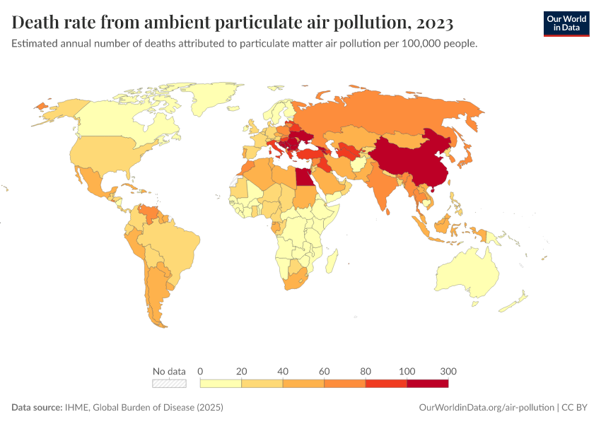IHME, Global Burden of Disease (2025) – with major processing by Our World in Data. “Death rate from ambient particulate air pollution” [dataset]. IHME, Global Burden of Disease, “Global Burden of Disease - Risk Factors - Deaths” [original data]. Retrieved March 5, 2026 from https://ai-search-suggested-topics-k.owid.pages.dev/grapher/death-rate-from-ambient-particulate-air-pollution