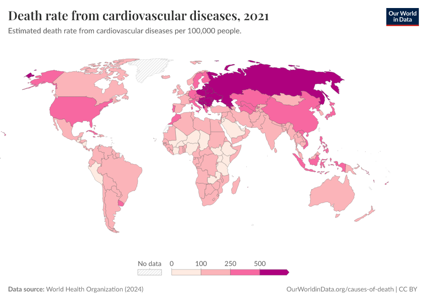 “Data Page: Death rate from cardiovascular diseases”, part of the following publication: Esteban Ortiz-Ospina and Max Roser (2016) - “Global Health”. Data adapted from World Health Organization. Retrieved from https://ai-search-suggested-topics-k.owid.pages.dev/grapher/death-rate-from-cardiovascular-disease-ghe [online resource]How to cite this data