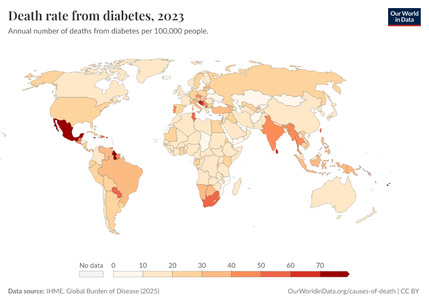 IHME, Global Burden of Disease (2025) – with major processing by Our World in Data. “Death rate from diabetes” [dataset]. IHME, Global Burden of Disease, “Global Burden of Disease - Deaths” [original data]. Retrieved March 5, 2026 from https://ai-search-suggested-topics-k.owid.pages.dev/grapher/death-rate-from-diabetes-gbd