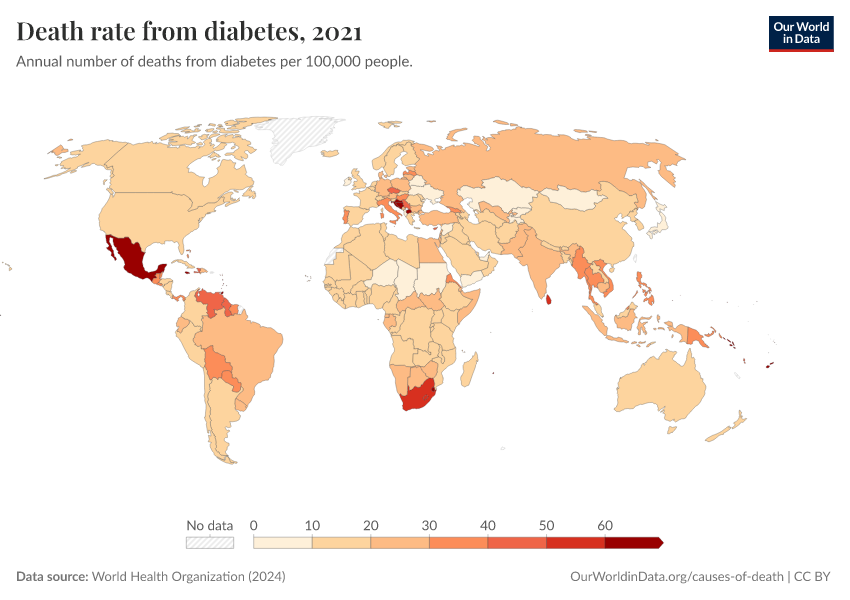 “Data Page: Death rate from diabetes”, part of the following publication: Esteban Ortiz-Ospina and Max Roser (2016) - “Global Health”. Data adapted from World Health Organization. Retrieved from https://ai-search-suggested-topics-k.owid.pages.dev/grapher/death-rate-from-diabetes-ghe [online resource]How to cite this data