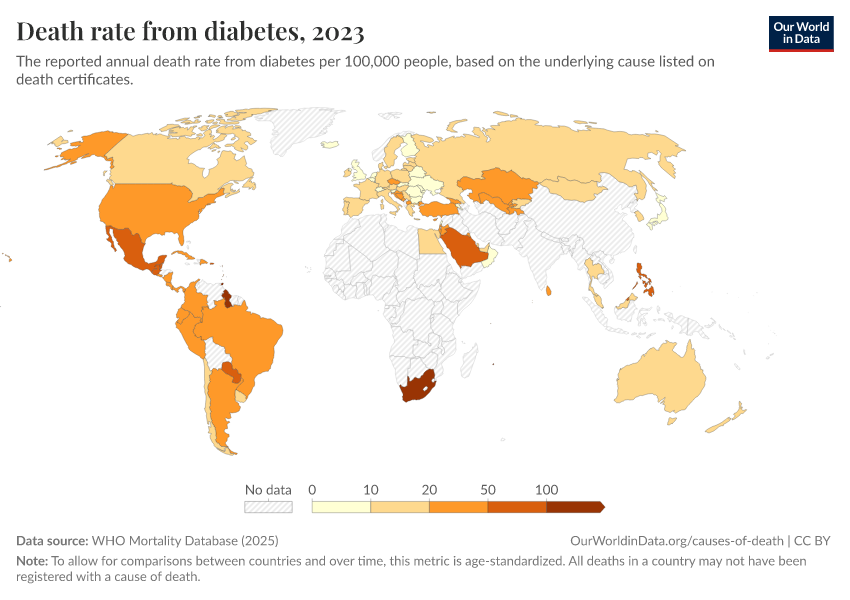 “Data Page: Death rate from diabetes”, part of the following publication: Saloni Dattani, Fiona Spooner, Hannah Ritchie, and Max Roser (2023) - “Causes of Death”. Data adapted from WHO Mortality Database. Retrieved from https://ai-search-suggested-topics-k.owid.pages.dev/grapher/death-rate-from-diabetes-who-mdb [online resource]How to cite this data