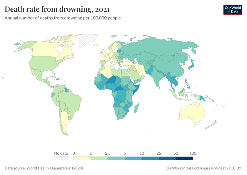 World Health Organization (2024) – with major processing by Our World in Data. “Death rate from drowning” [dataset]. World Health Organization, “Global Health Estimates” [original data]. Retrieved March 5, 2026 from https://ai-search-suggested-topics-k.owid.pages.dev/grapher/death-rate-from-drowning-ghe