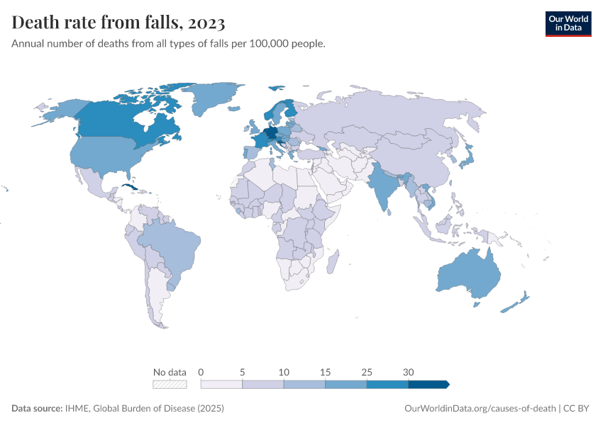 IHME, Global Burden of Disease (2025) – with major processing by Our World in Data. “Death rate from falls” [dataset]. IHME, Global Burden of Disease, “Global Burden of Disease - Deaths” [original data]. Retrieved March 5, 2026 from https://ai-search-suggested-topics-k.owid.pages.dev/grapher/death-rate-from-falls-gbd-rate