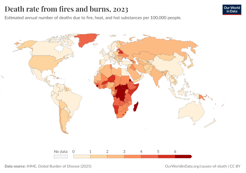 IHME, Global Burden of Disease (2025) – with major processing by Our World in Data. “Death rate from fires and burns” [dataset]. IHME, Global Burden of Disease, “Global Burden of Disease - Deaths” [original data]. Retrieved March 5, 2026 from https://ai-search-suggested-topics-k.owid.pages.dev/grapher/death-rate-from-fires-and-burns-ihme