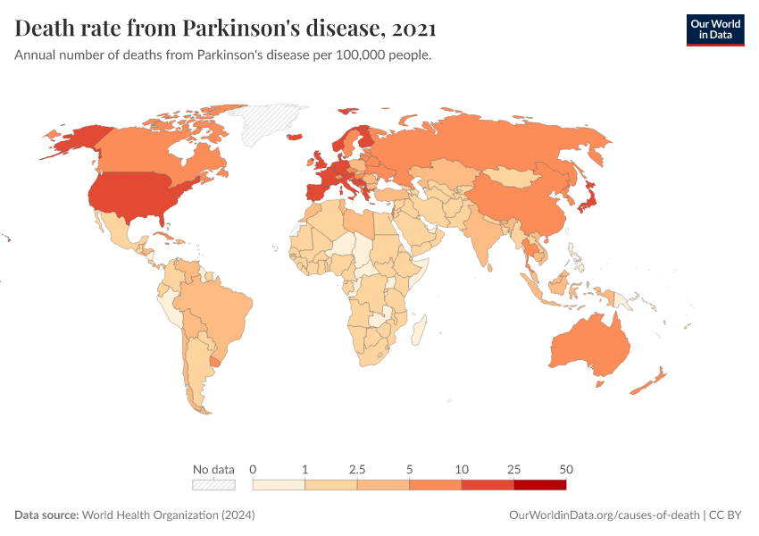 “Data Page: Death rate from Parkinson's disease”, part of the following publication: Esteban Ortiz-Ospina and Max Roser (2016) - “Global Health”. Data adapted from World Health Organization. Retrieved from https://ai-search-suggested-topics-k.owid.pages.dev/grapher/death-rate-from-parkinsons-disease-ghe [online resource]How to cite this data