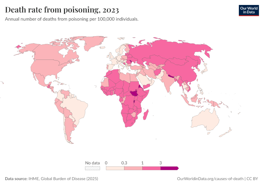 IHME, Global Burden of Disease (2025) – with major processing by Our World in Data. “Death rate from poisoning” [dataset]. IHME, Global Burden of Disease, “Global Burden of Disease - Deaths” [original data]. Retrieved March 5, 2026 from https://ai-search-suggested-topics-k.owid.pages.dev/grapher/death-rate-from-poisoning-gbd