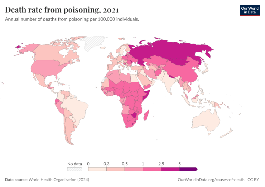 World Health Organization (2024) – with major processing by Our World in Data. “Death rate from poisoning” [dataset]. World Health Organization, “Global Health Estimates” [original data]. Retrieved March 5, 2026 from https://ai-search-suggested-topics-k.owid.pages.dev/grapher/death-rate-from-poisoning-ghe