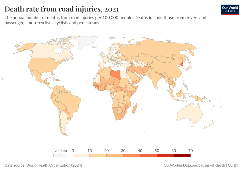 World Health Organization (2024) – with major processing by Our World in Data. “Death rate from road injuries” [dataset]. World Health Organization, “Global Health Estimates” [original data]. Retrieved March 5, 2026 from https://ai-search-suggested-topics-k.owid.pages.dev/grapher/death-rate-from-road-accidents-ghe