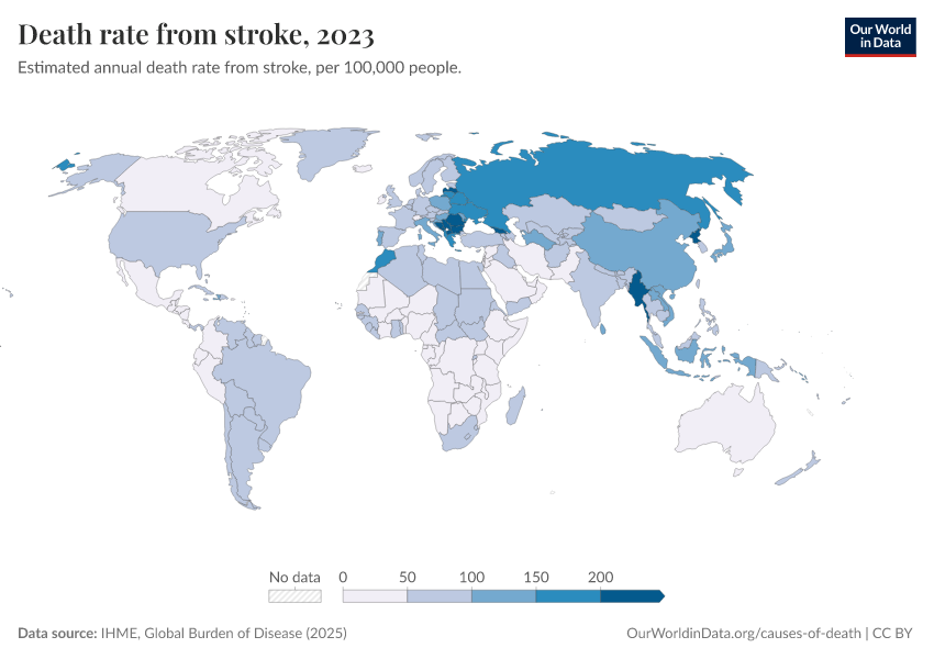 IHME, Global Burden of Disease (2025) – with major processing by Our World in Data. “Death rate from stroke” [dataset]. IHME, Global Burden of Disease, “Global Burden of Disease - Deaths” [original data]. Retrieved March 5, 2026 from https://ai-search-suggested-topics-k.owid.pages.dev/grapher/death-rate-from-strokes