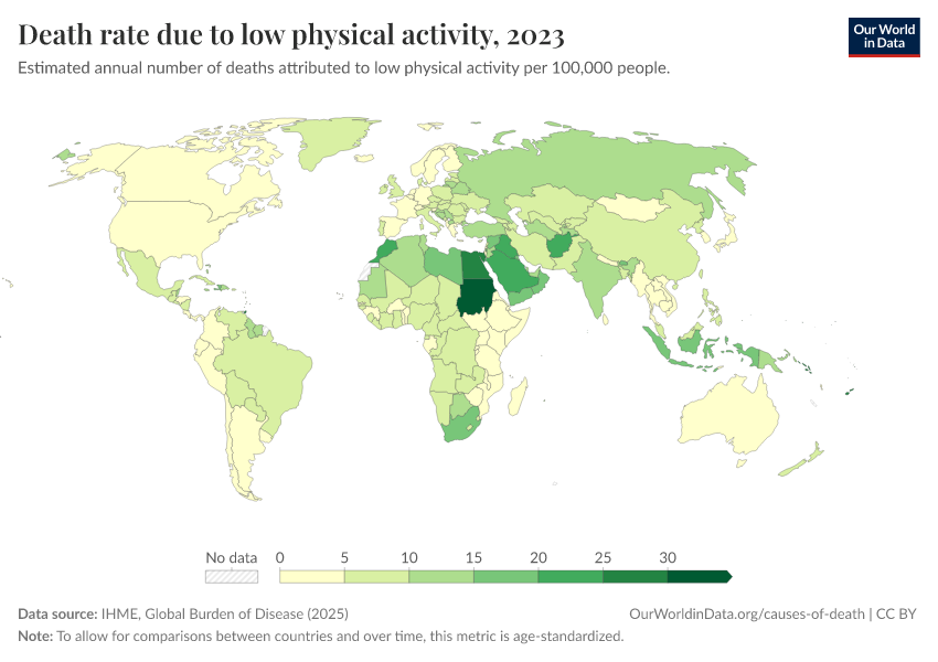 “Data Page: Death rate due to low physical activity”, part of the following publication: Esteban Ortiz-Ospina and Max Roser (2016) - “Global Health”. Data adapted from IHME, Global Burden of Disease. Retrieved from https://ai-search-suggested-topics-k.owid.pages.dev/grapher/death-rates-due-to-low-physical-activity [online resource]How to cite this data