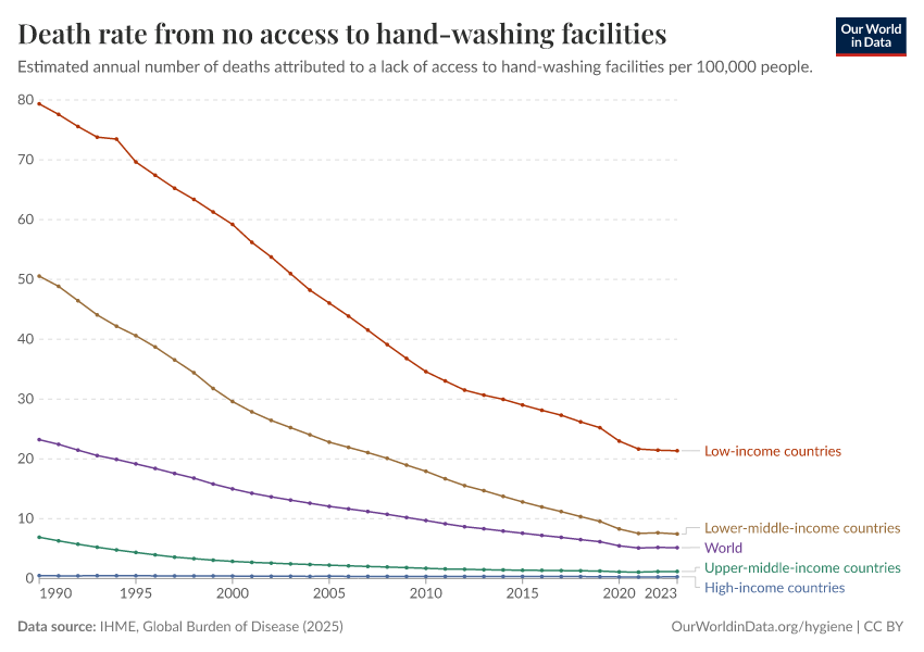 IHME, Global Burden of Disease (2025) – with major processing by Our World in Data. “Death rate from no access to hand-washing facilities” [dataset]. IHME, Global Burden of Disease, “Global Burden of Disease - Risk Factors - Deaths” [original data]. Retrieved March 5, 2026 from https://ai-search-suggested-topics-k.owid.pages.dev/grapher/death-rates-no-handwashing