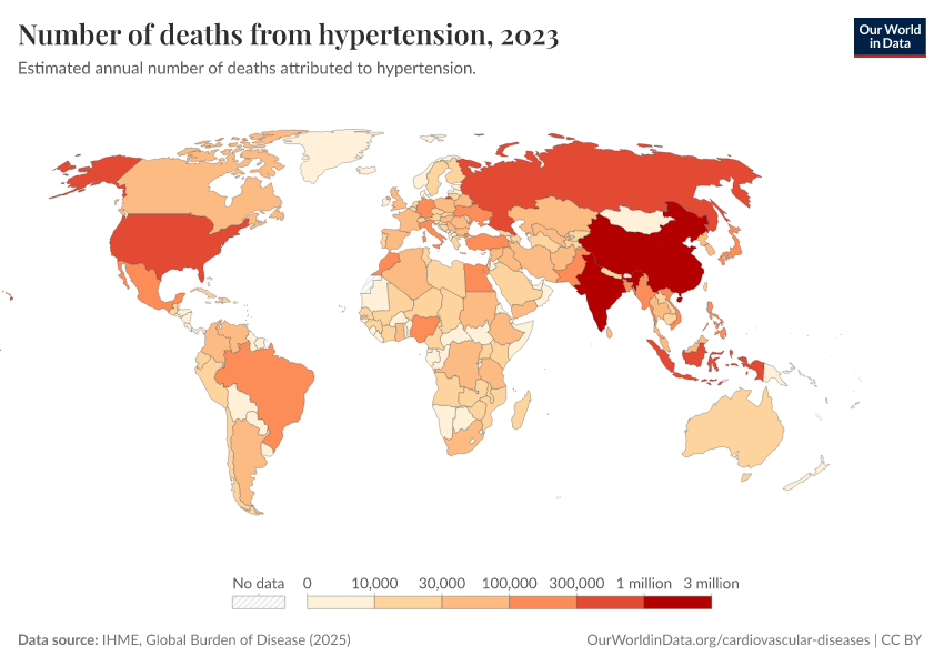 “Data Page: Number of deaths from hypertension”, part of the following publication: Esteban Ortiz-Ospina and Max Roser (2016) - “Global Health”. Data adapted from IHME, Global Burden of Disease. Retrieved from https://ai-search-suggested-topics-k.owid.pages.dev/grapher/deaths-due-to-high-blood-pressure [online resource]How to cite this data