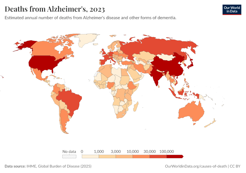 IHME, Global Burden of Disease (2025) – with major processing by Our World in Data. “Deaths from Alzheimer's” [dataset]. IHME, Global Burden of Disease, “Global Burden of Disease - Deaths” [original data]. Retrieved March 5, 2026 from https://ai-search-suggested-topics-k.owid.pages.dev/grapher/deaths-from-alzheimers