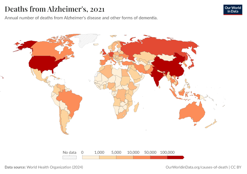 “Data Page: Deaths from Alzheimer's”, part of the following publication: Esteban Ortiz-Ospina and Max Roser (2016) - “Global Health”. Data adapted from World Health Organization. Retrieved from https://ai-search-suggested-topics-k.owid.pages.dev/grapher/deaths-from-alzheimers-other-dementias [online resource]How to cite this data