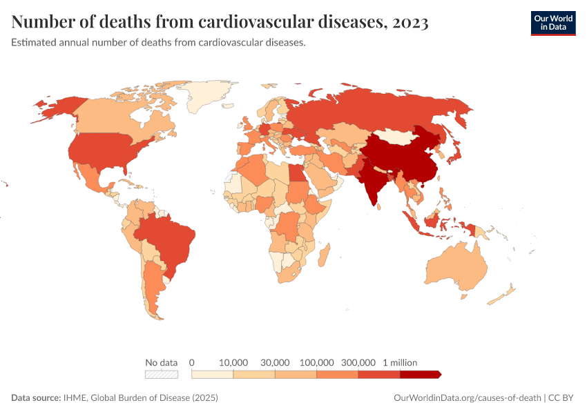 “Data Page: Number of deaths from cardiovascular diseases”, part of the following publication: Esteban Ortiz-Ospina and Max Roser (2016) - “Global Health”. Data adapted from IHME, Global Burden of Disease. Retrieved from https://ai-search-suggested-topics-k.owid.pages.dev/grapher/deaths-from-cardiovascular-disease [online resource]How to cite this data