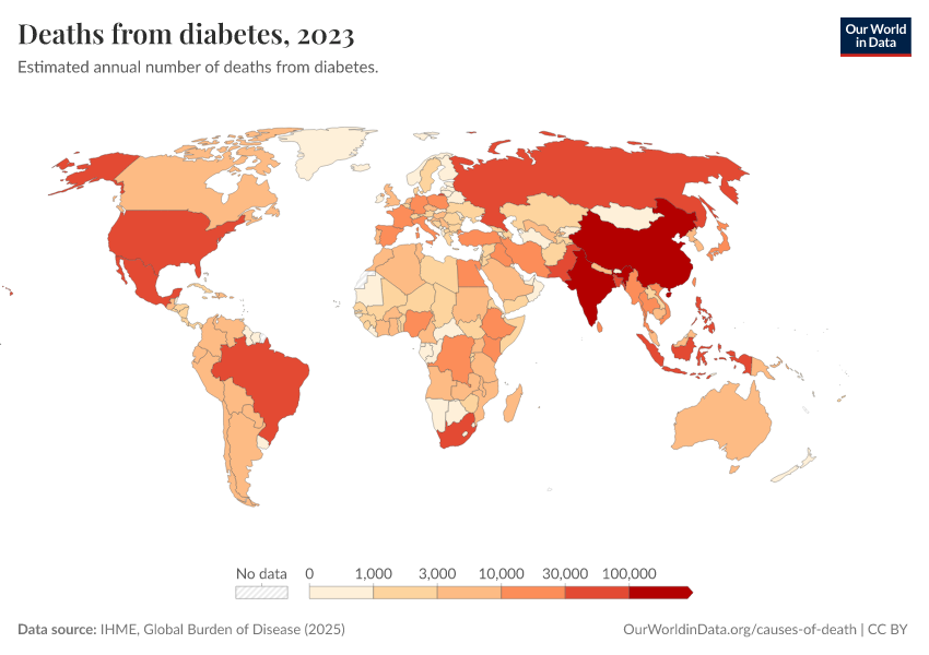 “Data Page: Deaths from diabetes”, part of the following publication: Esteban Ortiz-Ospina and Max Roser (2016) - “Global Health”. Data adapted from IHME, Global Burden of Disease. Retrieved from https://ai-search-suggested-topics-k.owid.pages.dev/grapher/deaths-from-diabetes [online resource]How to cite this data