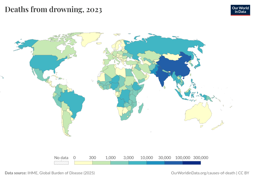 IHME, Global Burden of Disease (2025) – with major processing by Our World in Data. “Deaths from drowning” [dataset]. IHME, Global Burden of Disease, “Global Burden of Disease - Deaths” [original data]. Retrieved March 5, 2026 from https://ai-search-suggested-topics-k.owid.pages.dev/grapher/deaths-from-drowning