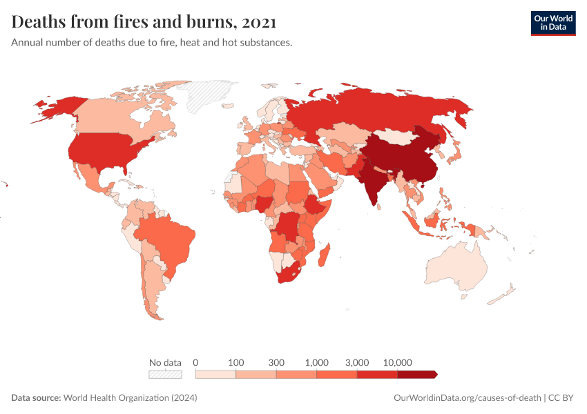 “Data Page: Deaths from fires and burns”, part of the following publication: Esteban Ortiz-Ospina and Max Roser (2016) - “Global Health”. Data adapted from World Health Organization. Retrieved from https://ai-search-suggested-topics-k.owid.pages.dev/grapher/deaths-from-fires-and-burns-who [online resource]How to cite this data