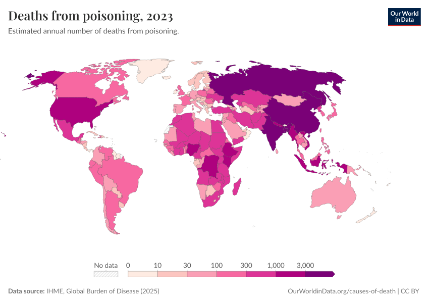 IHME, Global Burden of Disease (2025) – with major processing by Our World in Data. “Deaths from poisoning” [dataset]. IHME, Global Burden of Disease, “Global Burden of Disease - Deaths” [original data]. Retrieved March 5, 2026 from https://ai-search-suggested-topics-k.owid.pages.dev/grapher/deaths-from-poisoning