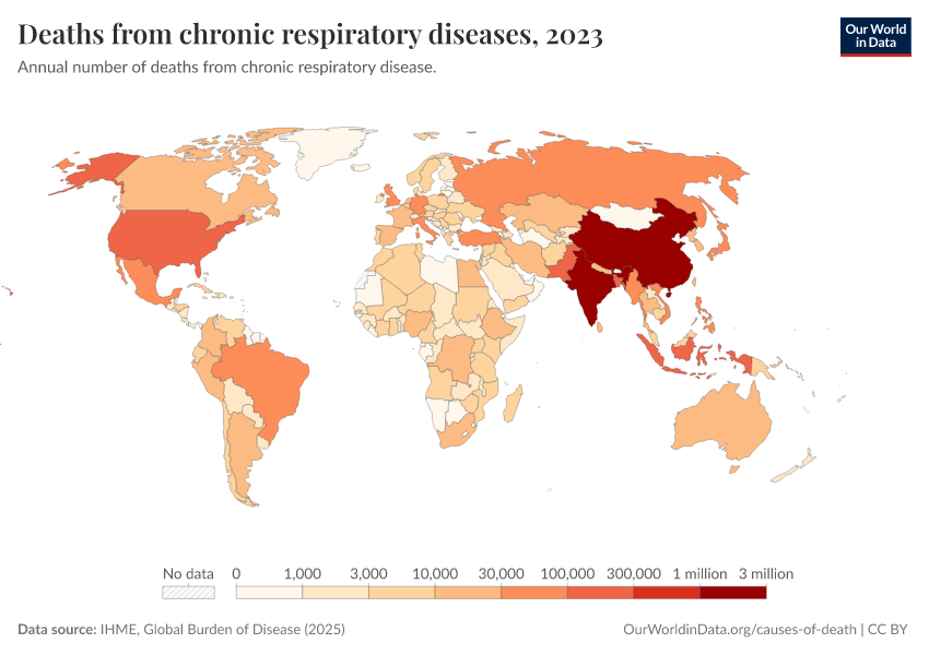 IHME, Global Burden of Disease (2025) – with major processing by Our World in Data. “Deaths from chronic respiratory diseases” [dataset]. IHME, Global Burden of Disease, “Global Burden of Disease - Deaths” [original data]. Retrieved March 5, 2026 from https://ai-search-suggested-topics-k.owid.pages.dev/grapher/deaths-from-respiratory-disease