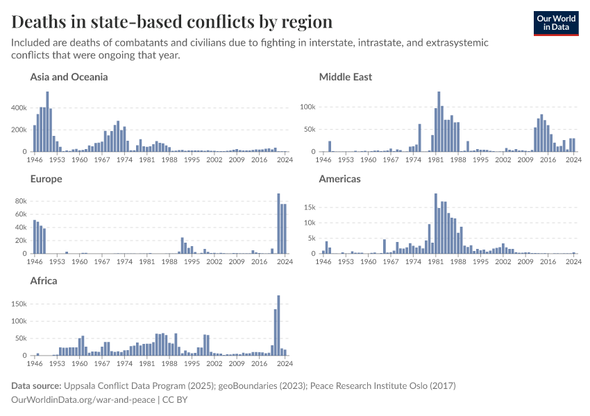 Uppsala Conflict Data Program (2025); geoBoundaries (2023); Peace Research Institute Oslo (2017) – processed by Our World in Data. “Deaths in state-based conflicts by region” [dataset]. Uppsala Conflict Data Program, “Georeferenced Event Dataset v25.1”; geoBoundaries, “geoBoundaries - Comprehensive Global Administrative Zones (CGAZ) 6.0.0”; Peace Research Institute Oslo, “Battle deaths v3.1” [original data]. Retrieved March 5, 2026 from https://ai-search-suggested-topics-k.owid.pages.dev/grapher/deaths-in-state-based-conflicts-by-region